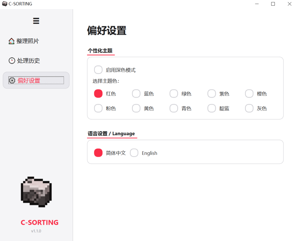 为了打破传统 Python GUI 工具“灰扑扑”的刻板印象,C-SORTING 采用 PyQt6 构建现代化的用户界面。在 app.py 中,我实现了一套基于 QSS 字符串注入的主题系统,支持 10 种配色方案与深色模式的动态切换。